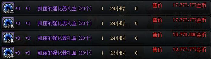 售价3888点券,保底能够获得1张+11装备强化券与20个凯丽的强化器,拍卖行中+11装备强化券的售价约为2500万金币,20个凯丽的强化器的售价约为1800万金币,合计4300万在金币寄售中价值约8600代币券,福袋售价为所获保底道具价值的45%。