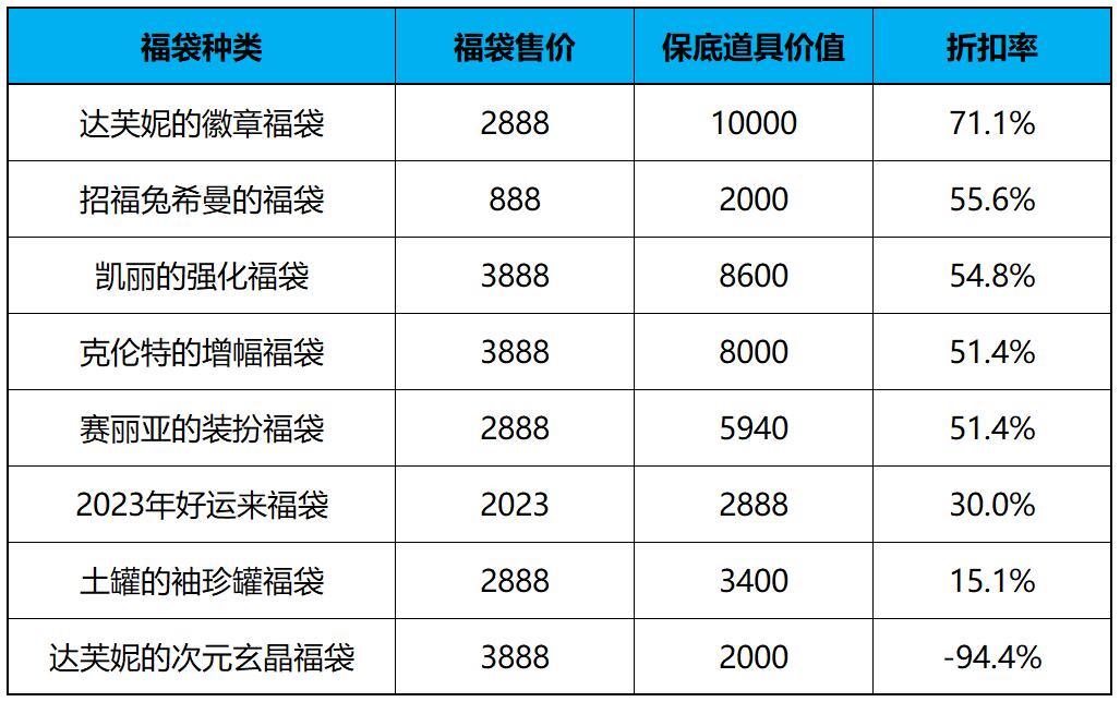 将福袋售价与福袋所获保底道具价值进行比较,可以计算出保底情况下各类福袋的折扣率。