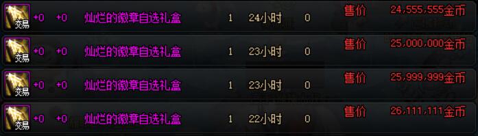 售价2888点券,保底能够获得2个灿烂的徽章自选礼盒,拍卖行中的单个售价约为2500万金币,在金币寄售中价值约10000代币券,福袋售价为所获保底道具价值的29%。