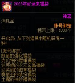 售价2023点券,能够在招福兔希曼福袋以外的6种福袋中随机获得一个,售价低于任何一款可获福袋的价格,肯定不亏,福袋售价为所获保底道具价值的70%。
