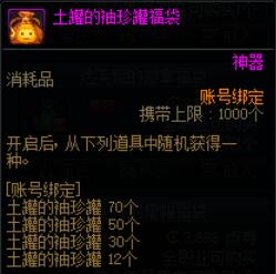 售价2888点券,保底能够获得12个土罐的袖珍罐,商城中12个土罐的袖珍罐售价3400点券,福袋售价为所获保底道具价值的85%。