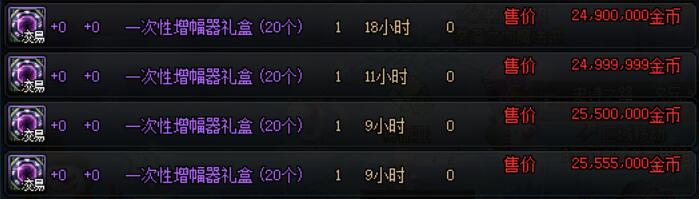 售价3888点券,保底能够获得1张+9装备增幅券与20个一次性增幅器,+9装备增幅券价值约1500万金币,拍卖行中20个一次性增幅器的售价约为2500万金币,合计4000万在金币寄售中价值约8000代币券,福袋售价为所获保底道具价值的49%。