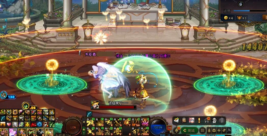 丹德尔进入“该结束了……”读条时,场地中会出现大量红色蒲公英,玩家需要引导落下的水球去清除地上的红色蒲公英,同时落下的水球也会造成高额伤害,需要躲避。