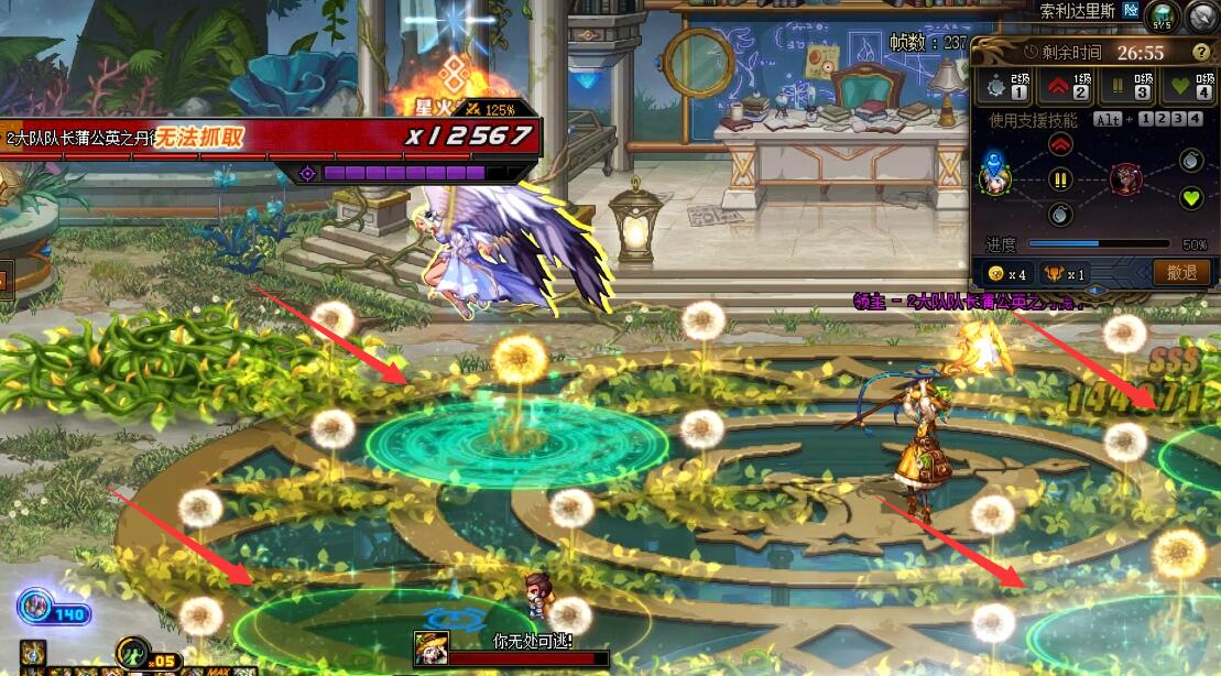 丹德尔进入“你无处可逃!”读条时,场地中会同时出现红色与绿色蒲公英,玩家站进绿色蒲公英范围内1秒即可进入漂浮状态,借此躲避红色蒲公英的爆炸,并且按空格键落在丹德尔的头上可以削韧。