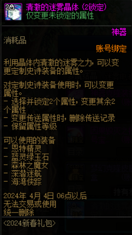 其次推荐兑换清澈的迷雾晶体(2锁定),当前版本中,一件完美的定制属性史诗可以极大提升流派的输出能力,定制属性史诗还没有毕业的小伙伴可以考虑兑换锁定2词条的迷雾晶体,洗出完美四词条或者三词条的概率又大了一些。