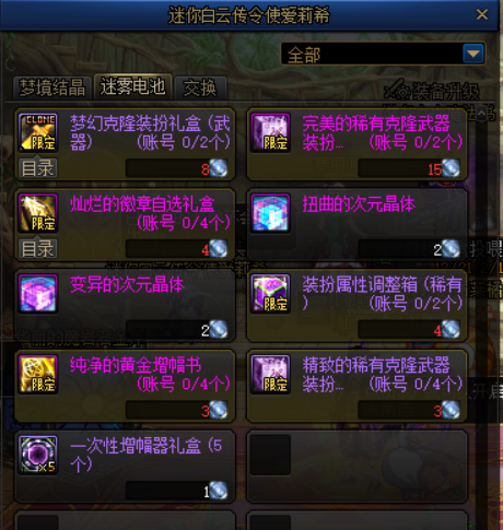 这个商店当中值得兑换的就是克隆武器装扮相关道具了,勇士们可以根据账号内角色需要来考虑是否兑换,2个迷雾电池耗资1350万,兑换一件稀有克隆武器装扮至少要开6个神秘礼盒,不是大号的话笔者并不建议这时候入手。