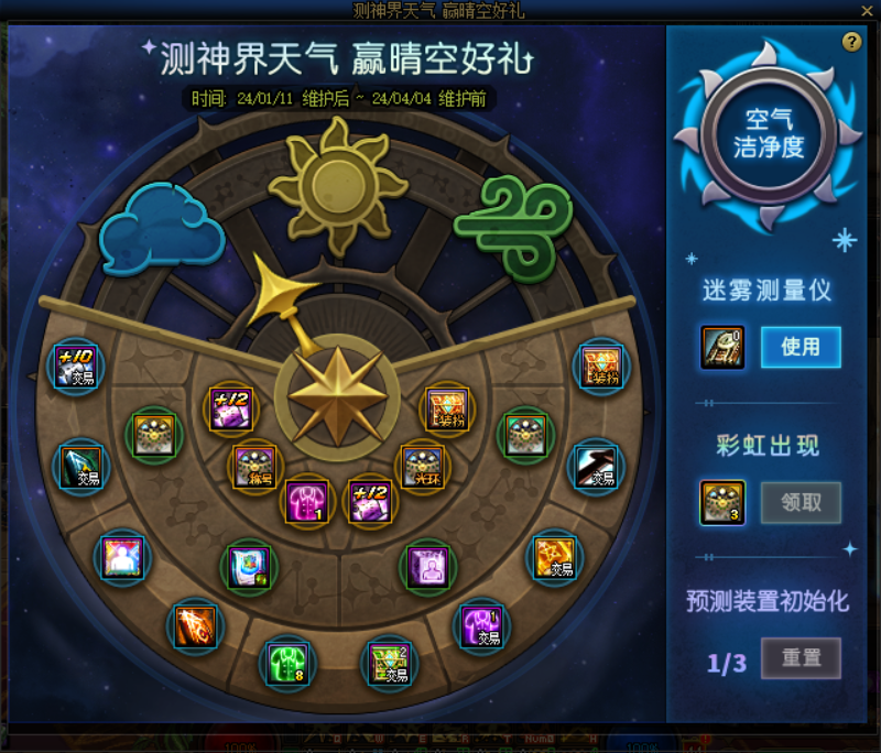 可以在测神界天气活动面板当中预测神界天气,获得普通、超能和特殊奖励。其中包含至尊宠物宝珠、至尊称号宝珠、至尊称号、至尊光环等高价值道具。购买10套新春礼包即可搬空一轮奖励,搬空即可领取至尊宠物、至尊装扮等奖励。