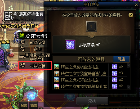 新春礼包当中的宠物礼盒、特别宝珠礼盒、光环礼盒、宠物宝珠神秘礼盒,都可以在艾莉希商店当中转换成梦境结晶。