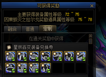该副本主要产出自定义装备,装备词条的等级范围为65~75。顺带一提,该副本也能产出星辰百变系列的装备,即小百变。