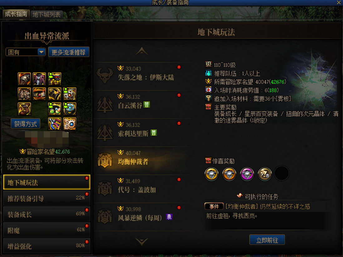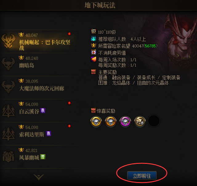 在地下城玩法界面,除了可以查看相关副本的入场名望值,快速接取副本对应任务以外。对于回归玩家来说最重要的就是快速找到副本所在位置了。点击本界面内的【立即前往】后,就能快速的找到想要去的副本了,非常便捷。