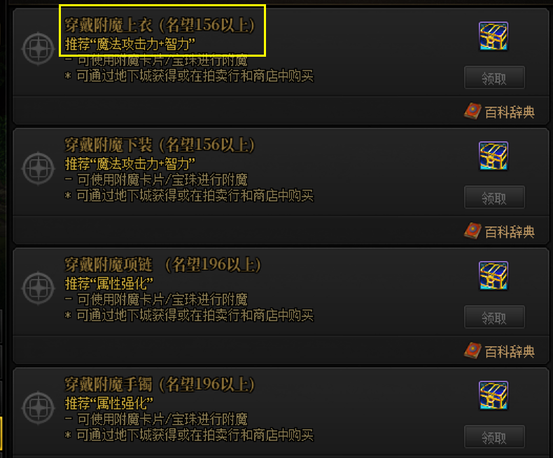 页面内的【百科辞典】也是可以用于点击的,点击后可以快速查询到当前职业的顶级附魔和获取渠道。
