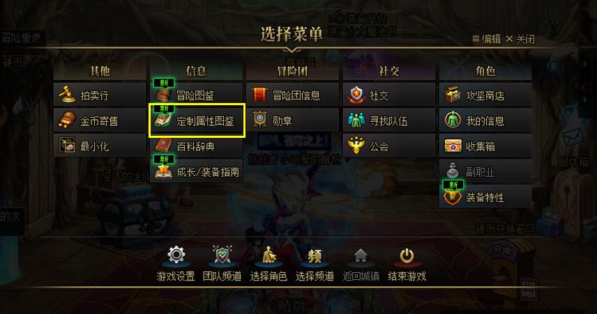 首先通过【esc】按钮呼出【选择菜单】,选中【信息】标签下的【定制属性图鉴】。