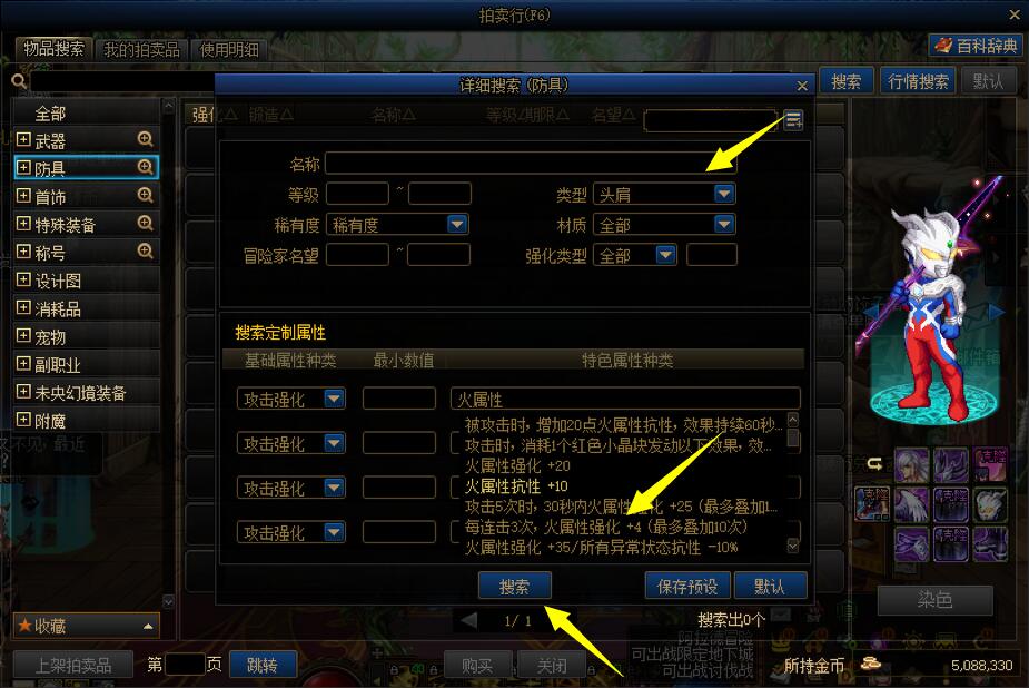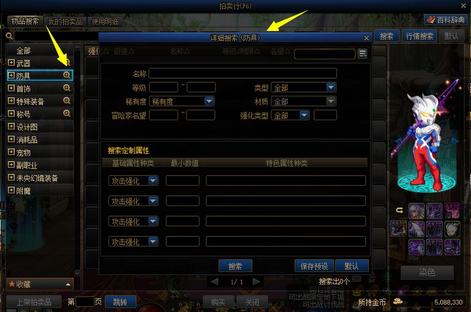 第一步在点击拍卖行装备部位右侧的加号,呼出【详细搜索】界面。