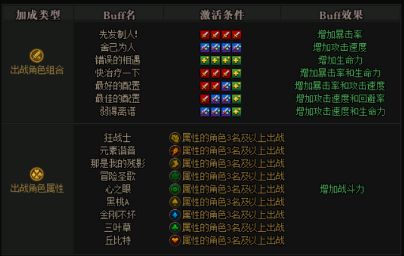 根据派遣角色组合不同,可产生不同的效果,包括增加暴击、生命值、攻击速度、回避率属性。