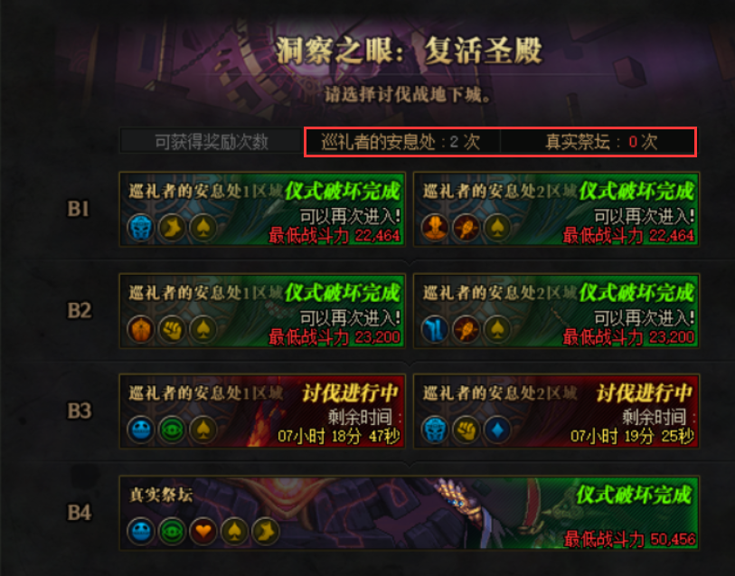 5、巡礼者的安息处可领取8次奖励,真实祭坛每周可领取1次奖励,意味着即便通关真实祭坛后,也能再返刷一次B1~B3。