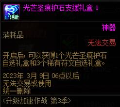 目前在升级加速作战活动中可以获得3个光芒圣痕护石自选礼盒与9个稀有符文自选礼盒,战令中也有相关奖励。