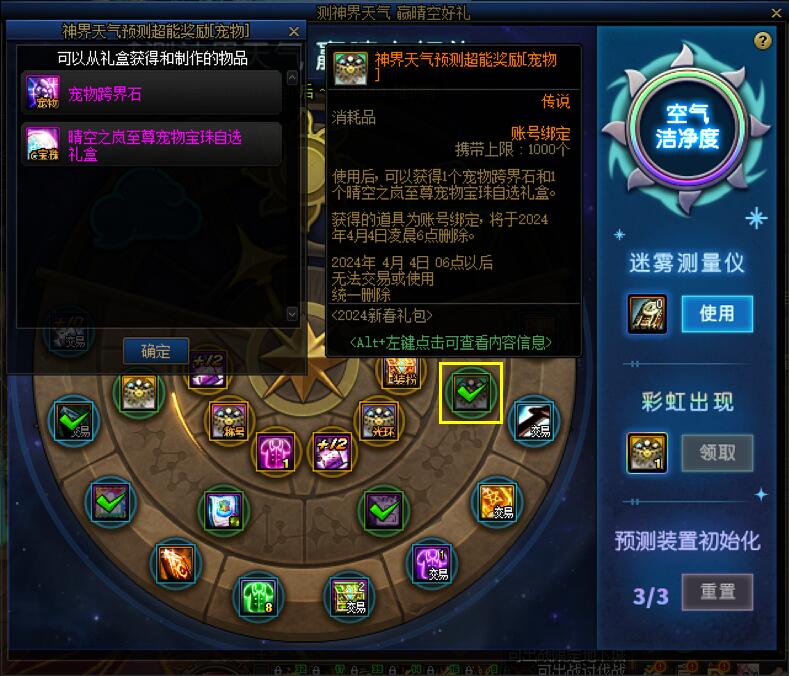 玩家们的新春礼包产物先不要乱用,新春礼包中的宠物礼盒、宠物宝珠礼盒、光环礼盒、宠物宝珠礼盒都可通过活动NPC的“材料兑换”功能兑换为数量不等的[梦境结晶]。