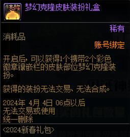 [梦幻克隆皮肤装扮]可以在第一次购买晴空之岚礼包时赠送的[2024年新春礼包首购惊喜礼盒]中获取,首购礼盒中包含1个[梦幻克隆皮肤装扮礼盒]。