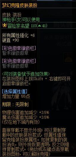 [梦幻克隆皮肤装扮]是今年新春礼包内的全新道具,可以复制穿戴中的皮肤装扮款式,但属性值保留克隆装扮原属性,与普通的新春皮肤相比,额外多了55点四维(自选)与41点名望值。