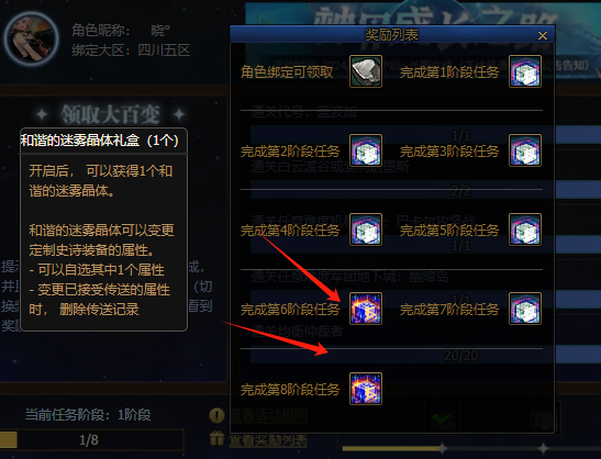 “神界成长之路”8周可以拿完所有奖励(需完成所有每周任务),可以获得1000个微光悬浮石(兑换大百变),15个锁1词条洗衣粉,2个“和谐的迷雾晶体”(词条传送洗衣粉,简单理解为落地2词条自定义可以依靠该晶体变为完美4词条)。点击右下角“神界成长之路”即可参与活动,该活动仅可以绑定一个角色,因此绑定前先确定是否需要为该角色分配该资源。