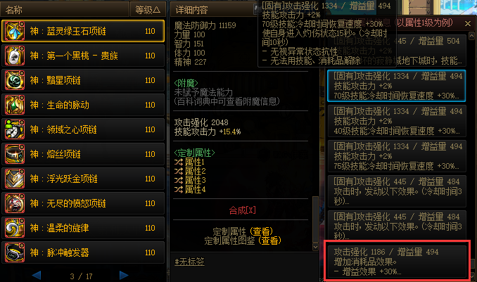蓝灵绿玉石项链选择词条:消耗品效果+30%,20单属强。剩下两个词条可以选择自异常技攻词条。