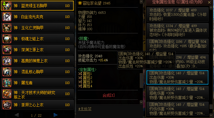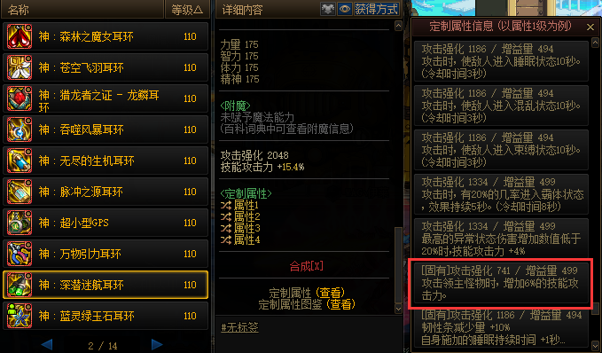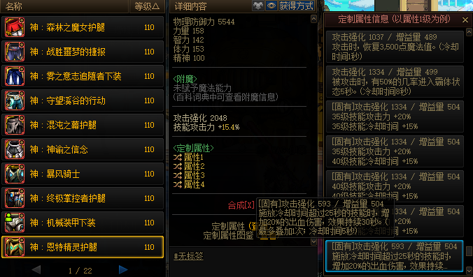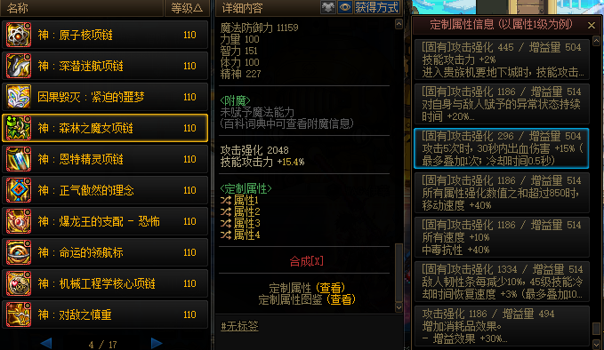 森林之魔女同样需要20单属强和20全属强,剩下的两个词条选择技能恢复速度+30%和5%技攻。这30%的技能恢复弥补了大部分职业缺少续航的短板,对于爆发职业来说几乎是必选。