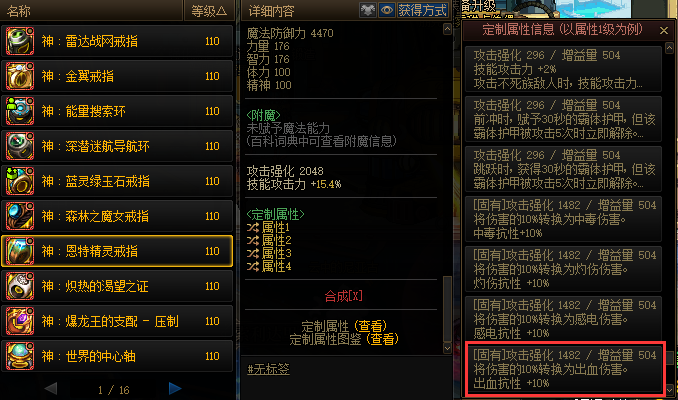 恩特精灵戒指选择朴实无华四件套:10%出血伤害、10%出血伤害转化、20单属强和20全属强。