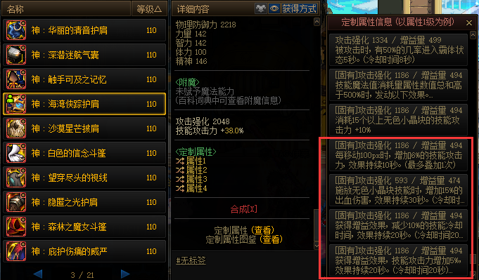 海湾侠踪护肩选择释放无色技能时增加15%出血伤害、移动时增加6%技攻,剩下两个词条选择5%技攻和10%CD的固定搭配。有CD,有伤害,触发条件也不苛刻。最佳选择之一。