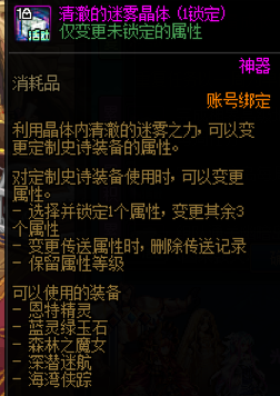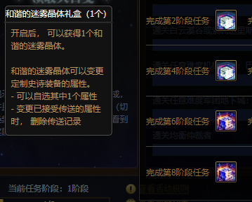 另外,在神界成长之路活动的第6/8阶段分别可以获得1个和谐的迷雾晶体,用该道具可以将2词条的自定义装备变成4词条的自定义装备。