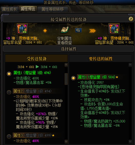 直接获得完美的四词条装备可能性较低,后期一般都会通过属性传送功能来加工装备,从而获得3词条、4词条的自定义装备。所以,勇士们在洗自定义装备的时候,若是碰到高价值的词条,也可以保留一下,后期用来完善其他自定义装备。