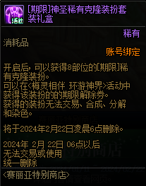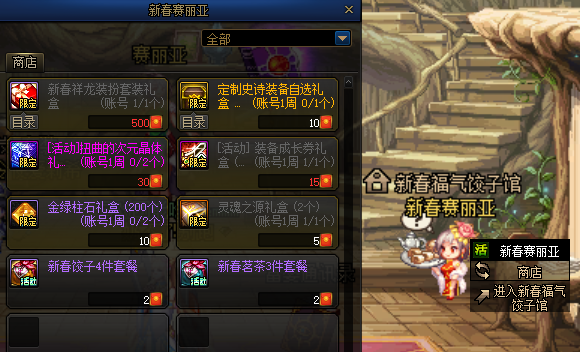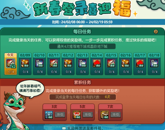 在赛丽亚旅馆内活动Npc处参与活动,完成任务获取的道具与活动商店内兑换的道具于2.22凌晨6点到期删除。喜欢祥龙装扮的勇士千万不要错过了!