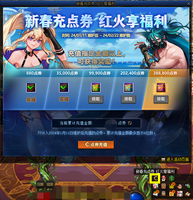 活动期间内已充值点券的勇士,不要忘记点击活动图标领取并使用对应充值奖励哦!2.22凌晨6点删除未使用道具!