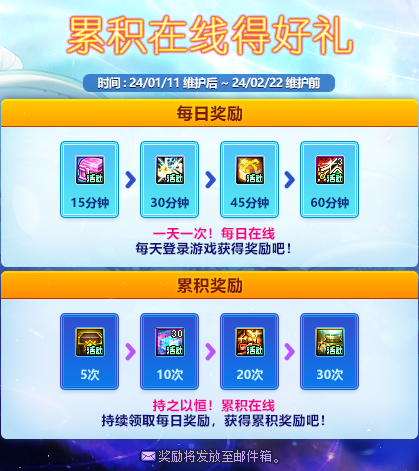 2.1维护后~2.22维护前登录游戏,即可点击活动图标领取特别快递。快递道具为:5个[活动]雾核礼盒(2000个)+2024欢乐代币券。