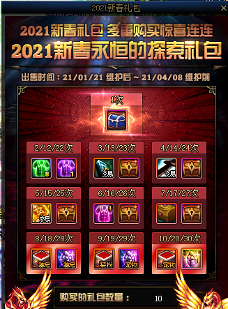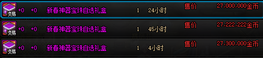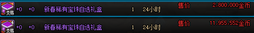 一个礼包内包含两个新春特别宝物礼盒。选择获得神秘礼盒可以卖到2000w多一点金币,当然也可以选择获得自选礼盒对角色进行打造。