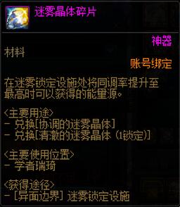 【迷雾晶体碎片】需要通过【同调奖励系统】获取,每个角色每周可以获取1个,交易类型为账号绑定。