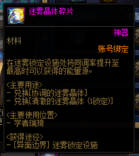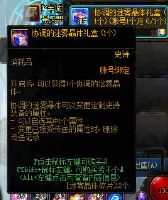 获得的迷雾晶体碎片可以在学者瑞琦商店当中兑换协调的迷雾晶体礼盒,单次兑换需要消耗12个迷雾晶体碎片,账号每个月可以兑换一次。使用协调的迷雾晶体时,可以将定制史诗装备的一个属性自由变更。冒险家们刷到2毕业词条的定制属性史诗时可以保留下来,后续获得协调的迷雾晶体之后,可以直接将其变更成3毕业词条的定制属性史诗,最后使用词条传送功能传送一个毕业词条,即可达成完美四词条定制属性史诗。