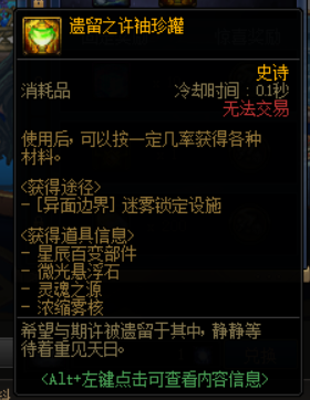 遗留之星袖珍罐打开之后可以从星辰百变装备兑换券或定制属性史诗装备当中随机获得一种,遗留之许袖珍罐打开之后可以从星辰百变部件、微光的悬浮石、灵魂之源和浓缩雾核当中随机获得一种,打开遗留之梦袖珍罐可以从协调的迷雾晶体、清澈的迷雾晶体(2锁定)、清澈的迷雾晶体(1锁定)和扭曲的次元晶体当中随机获得一种。