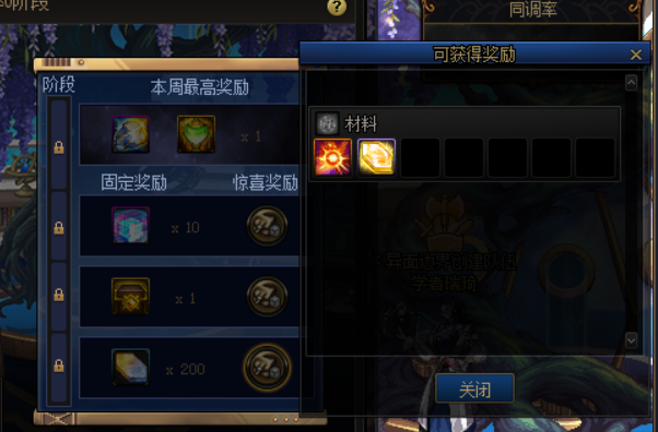 同调率一阶段奖励200个雾核,外加的惊喜奖励为灵魂之源和浓缩雾核;