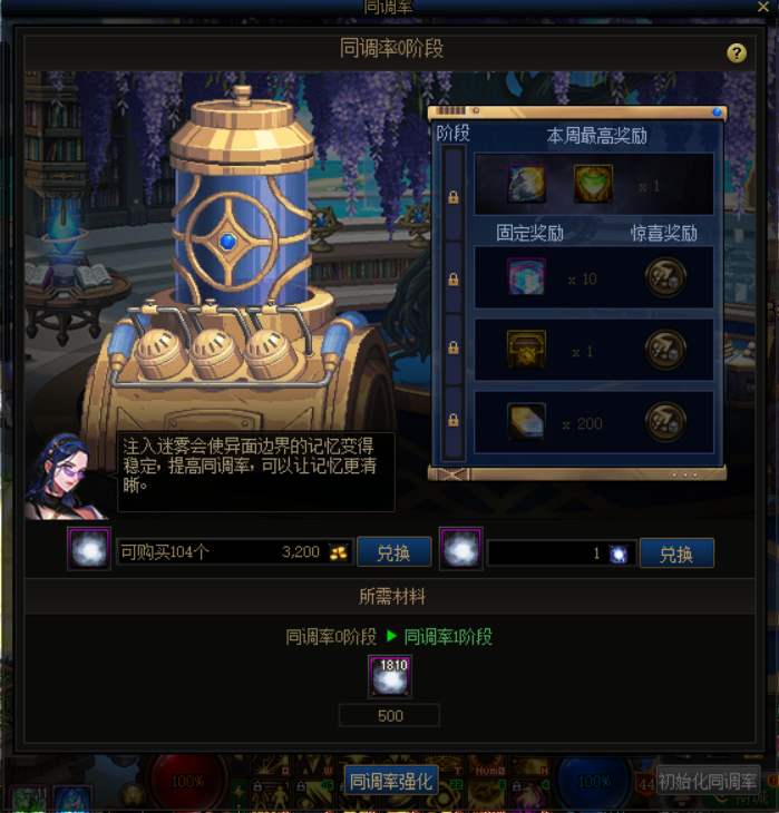 同调率系统当中,奖励等级最多可以提升至四阶段,每提升一级奖励阶段需要消耗500个稀薄迷雾,不足时可以在同调率系统当中以3200金币的单价购买稀薄迷雾。