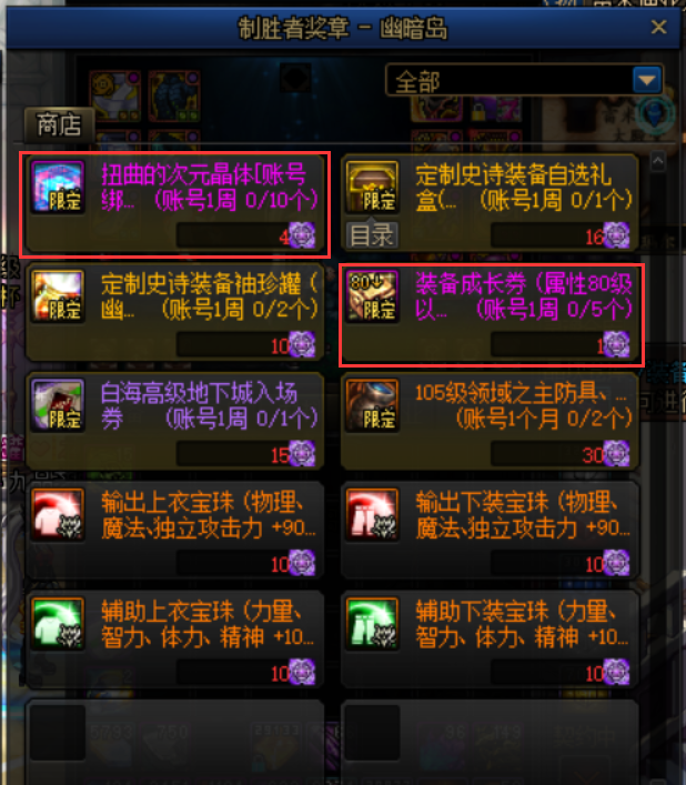 扭曲的次元晶体、装备成长券:值得优先兑换。幽暗岛商店出售的成长券为属性80级以下,可用于勇士级高级地下城产出的史诗装备成长。