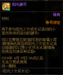 上文提到的阳关硬币,可以在该NPC商店当中兑换奖励。但是除此之外,每日登录游戏,每通关推荐地下城和高级地下城,都可以固定获得阳光硬币。其中每日登录游戏固定获得一个,每通关推荐地下城大约获得1个,每通关高级地下城大约获得4个。