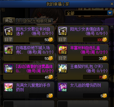活动共持续7周,单角色的情况下可以获得159*7+116*5(因为只能培养5个女儿)=1693枚阳光硬币,而搬空所有奖励需要820+200*7=2220枚阳关硬币。当然通过打工和小游戏还可以零星获得阳光硬币,但是再派一个角色参与日常的推荐地下城和高级地下城,这样可以确保搬空道具商店。