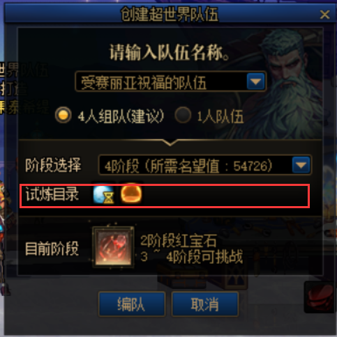玩家可以选择单人或者组队挑战,根据挑战的阶段不同,可能会有不同的试炼目录。可以在创建队伍时查看。