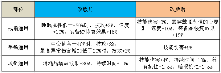 特殊装备三部位的公共词条改动也不少,将两个当前版本的冷门词条进行了重做。同时也直接将辅助装备“释放技能恢复队友生命值时,CD恢复速度+20%”变为辅助职业专属并删除前置条件。
