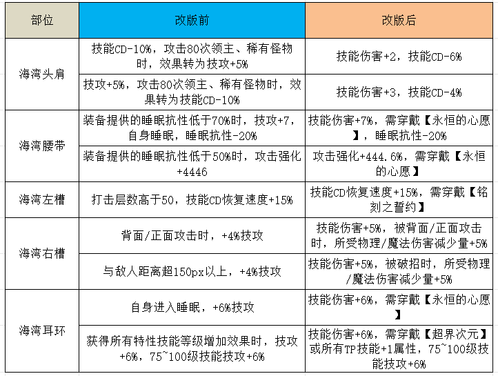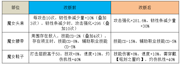 魔女腰带的减CD词条进行了重做,剔除了条件机制,魔女鞋的这个专属词条也同样直接变为专属流派的专属词条。