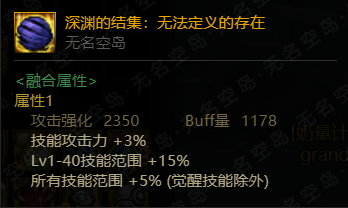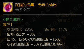若融合三件深渊的结集装备,则可提升除觉醒外全技能30%技能范围。但是由于buff量为五套装备中最低的,奶系职业又会在符文栏处佩戴增加关键技能范围的符文,所以不适合奶系职业使用。