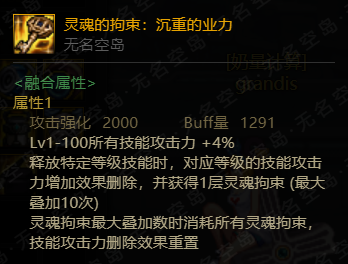灵魂的拘束三件融合装备每件都提供4%技攻,2000攻击强化和1291buff量。同时会有负面效果,在释放1次对应等级技能后释放第二次就不会受到4%技攻的加持。