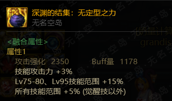 深渊的结集三件套为简单直接的提升技能范围的融合装备,除三件装备都固定提升5%全技能范围外,辅助装备提升1-40级技能15%范围,魔法石提升45、60-70级技能范围,耳环提升75-80和95级技能范围。