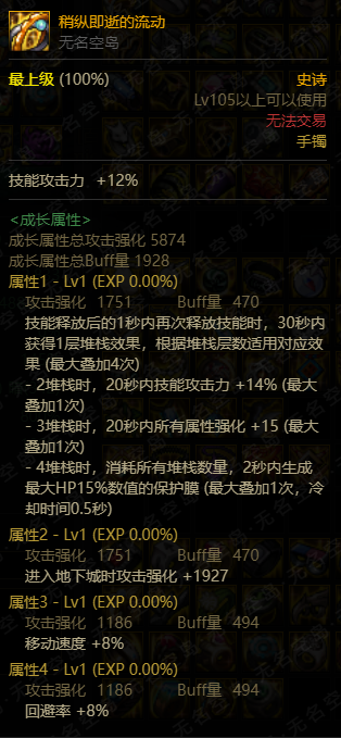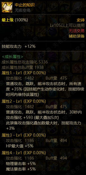 次元回廊辅助装备“中止的知识”的属性简直是为基础精通流派量身定做:普通攻击、跳跃,前冲攻击时增加35%所有速度,攻击强化和3%的技能攻击力, 非常适合基础精通流审判使用。