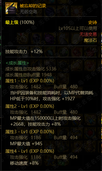 空血流派由于锁定1%的血量,使得部分释放技能需要消耗生命值的职业无法使用。次元回廊魔法石“被忘却的记录”可以将MP代替HP作为装备和技能的消耗,装备回廊右槽后,狂战士、召唤师等职业也可以走空血攻速流派,